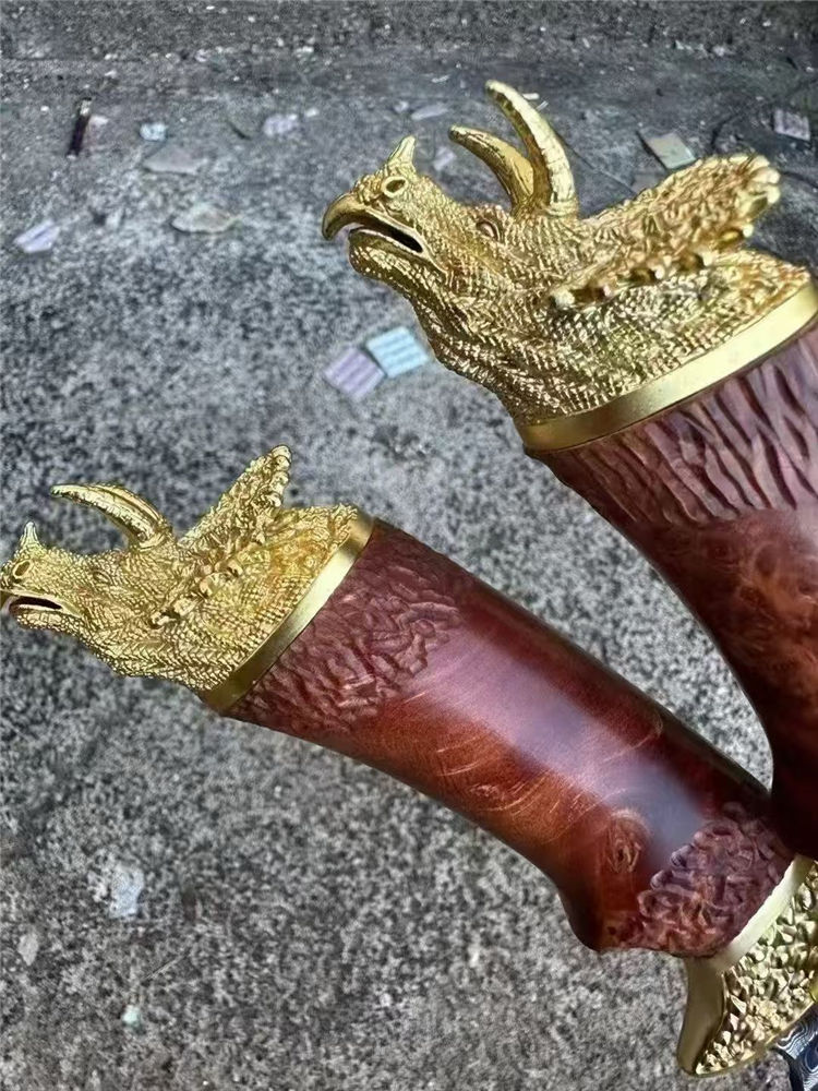 大马士革犀牛三角龙直刀 总长:30cm 刃长:14.8cm 刃厚:4mm 刃宽:3.3cm 钢材:进口锻造大马士革钢VG10钢芯103层 工艺:镀金,表面保留锻造捶打陨石纹理 热处理:专业真空热处理,淬火回火 硬度:60-62HRC 开刃:水冷多次开刃,设计以锋利度为主,保持性较好 重量:248G 手柄:镀金三角龙头+精选进口红影木瘤 皮套:意大利手工大师手作,纯手工雕花缝线,复古棕色工艺,手工雕刻图案 包装:复古手工盒子包装