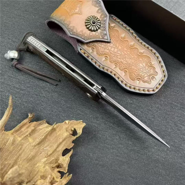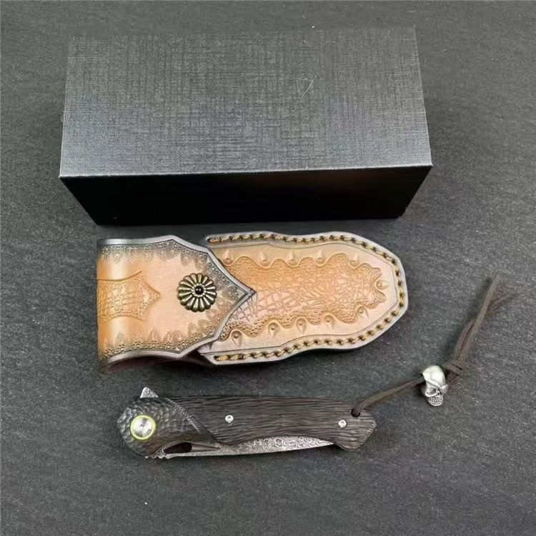 大马士革黑马折刀 全长:19.5cm 刃长:8.5cm 柄长:11.5cm 刃宽:2.3cm 刃厚:3mm 刃材:大马士革钢 柄材:微粒红檀木 刀重:100/145G(含皮套) 毛量:227G 硬度:58-60HRC 包装:皮套+礼盒