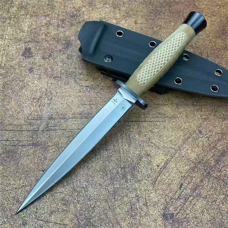 斯巴达联名双刃直刀 全长:26cm 刃长:15cm 柄长:11cm 刃宽:2.2cm 刃厚:0.5cm 刃材: VG-10 柄材:G10 硬度;59HRC 净重:192克 毛重:401克