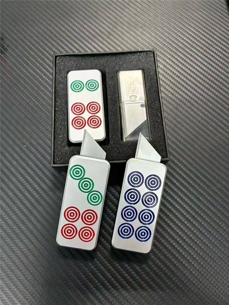 麻将推牌美工刀 总长:8.6cm 刃长:2cm 刃宽:6.5cm 美工:碳钢 柄材:T6061航空铝合金 柄长:6.5cm 柄宽:3cm 柄厚:1.2cm 重量:55G