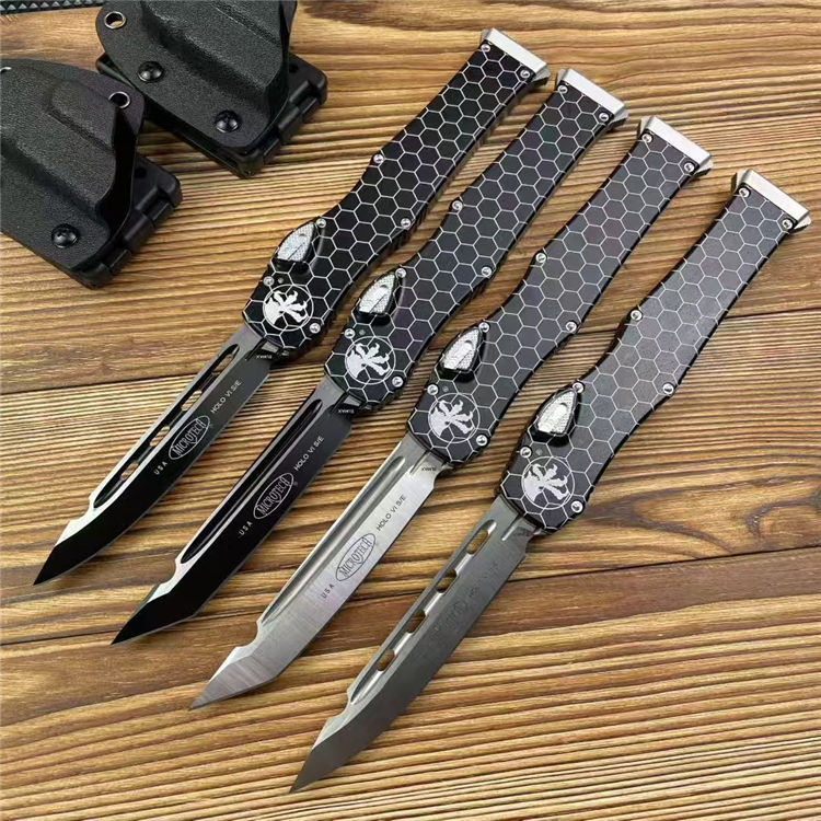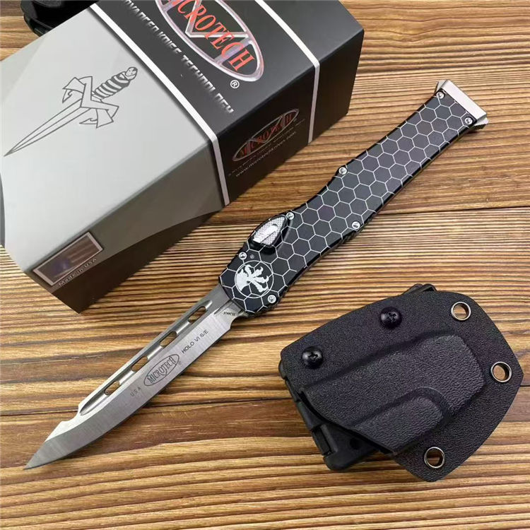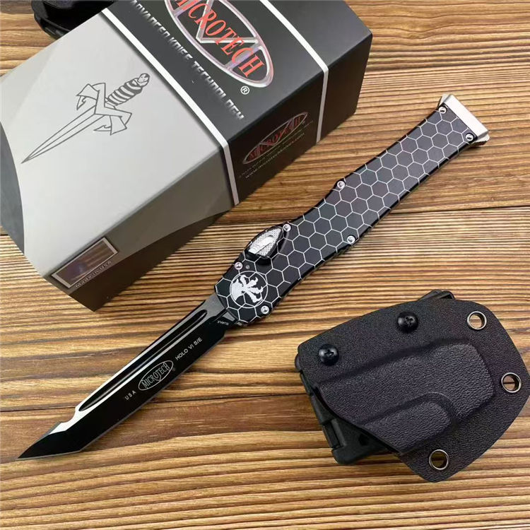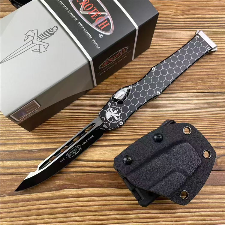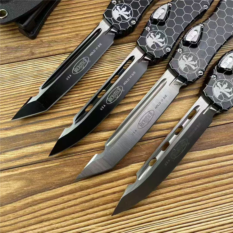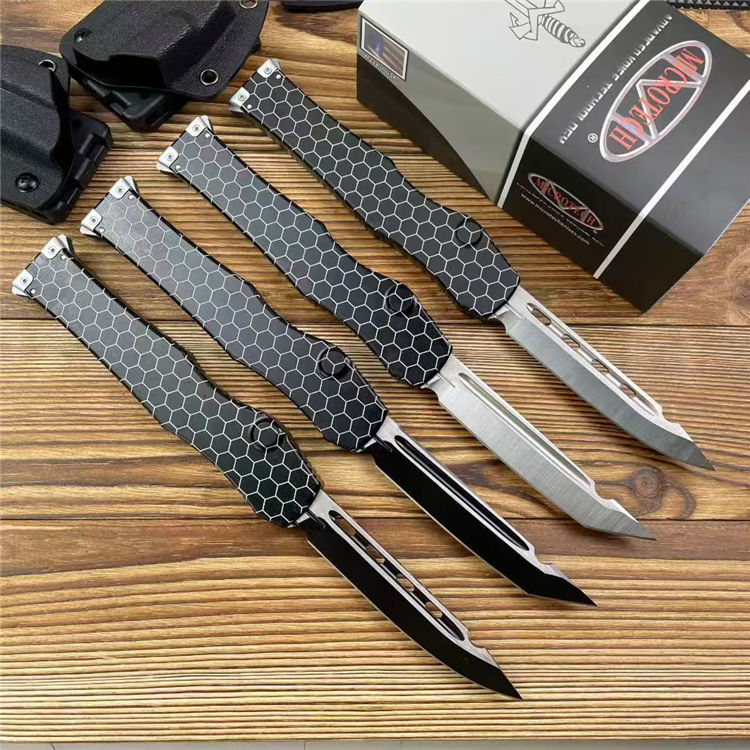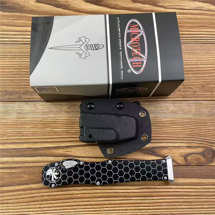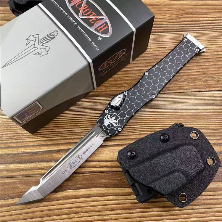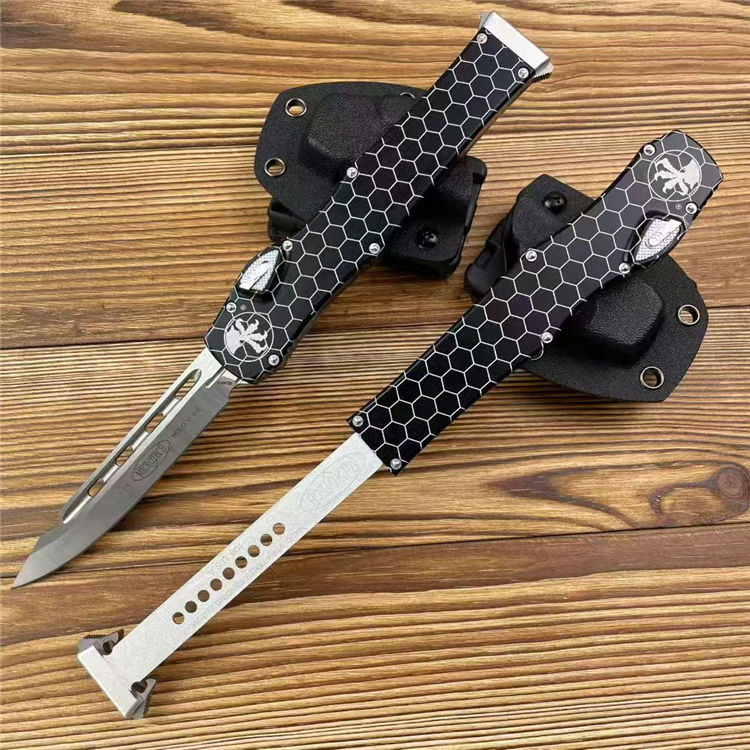 微技术蜂窝柄光晕6直出跳刀 全长:21cm 刃宽:2cm 刃长:10.3cm 柄长:16cm 刃厚:3mm 刃材:5CR13 柄材:铝合金 刀重:142G 毛量:155G 硬度:58-60HRC