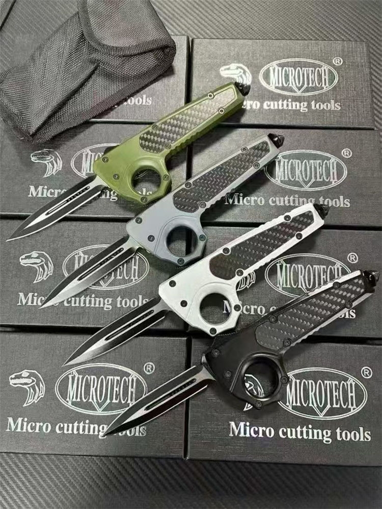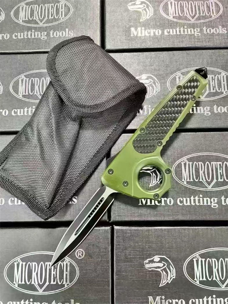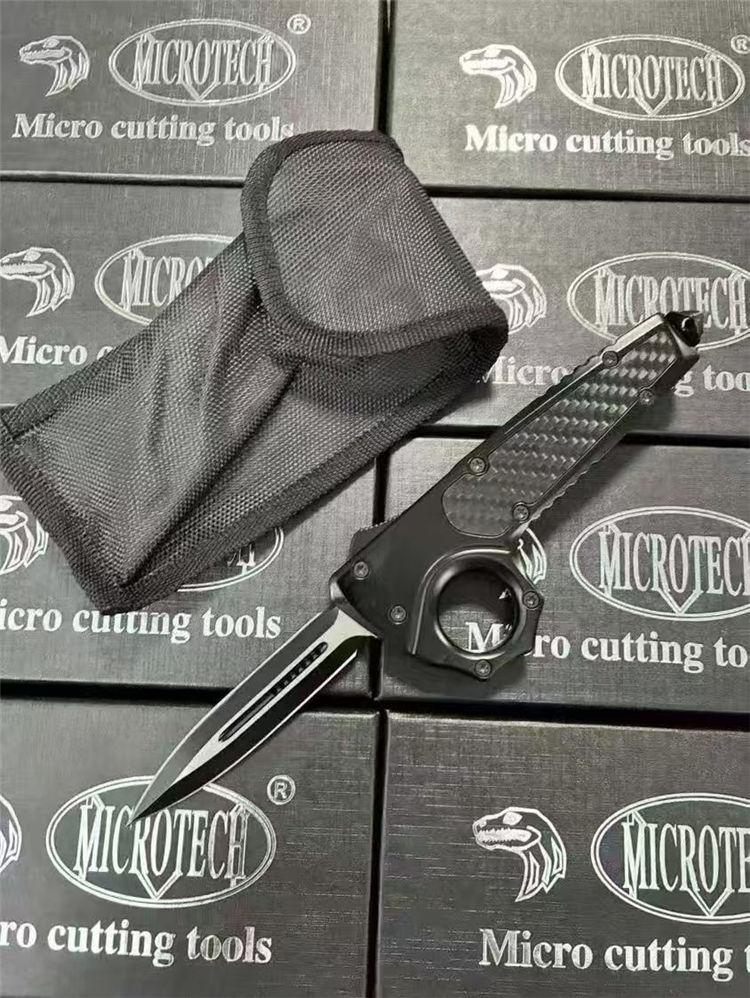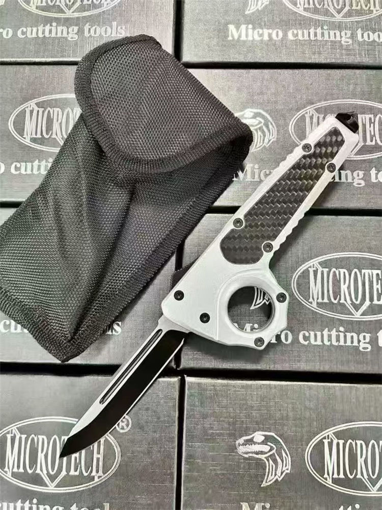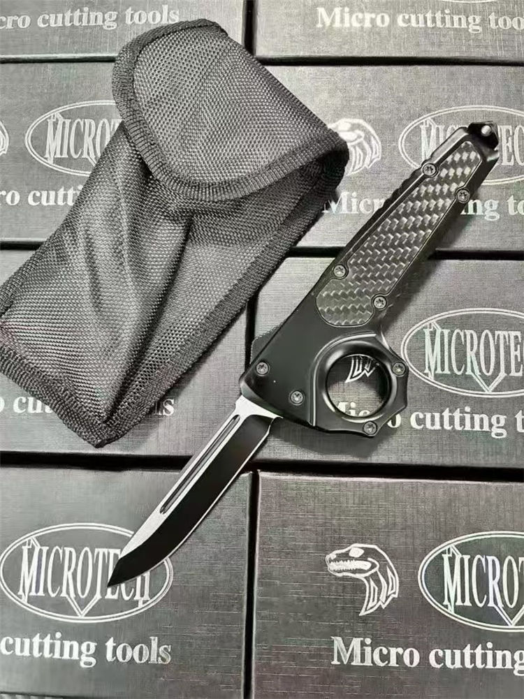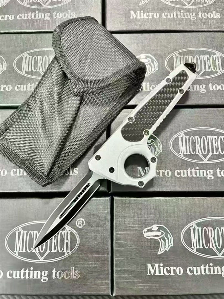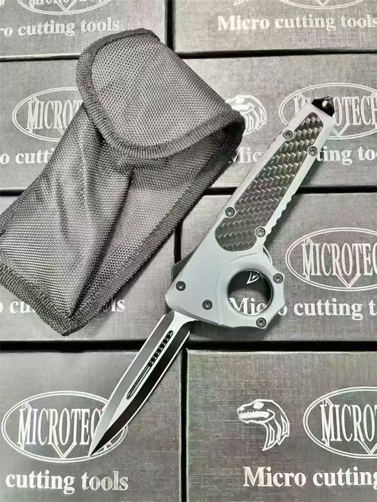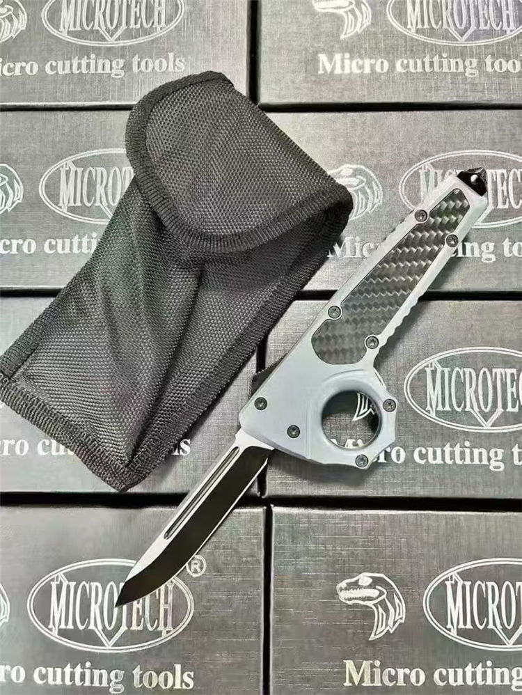 微技术伤齿龙指环直出跳刀 全长:23cm(含破窗锥) 刃长:8.8cm 柄长:13cm 刃宽:2.2cm 刃厚:0.3cm 刃材:440 柄材:锌合金+碳钎 硬度:58-60HRC 重量:220克(净刀)242克(刀+套) 配置:带尾锥破窗功能,背夹,尼龙刀套