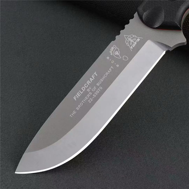 美国TOPS战术生存直刀 全长:25cm 刃长:9.8cm 刃材:154CM 硬度:60-61HRC 表面:镀钛石洗做旧工艺 柄厚:2.3cm 柄材:Black Linen Micarta®黑色亚麻卡塔,内藏红钢纸 刃厚:6mm 刃宽:3.2cm 重量:296克、10.45OZ 设计者:TOM BROWN 类型:生存刀,自带KYDEX刀鞘+打火石镁棒,佩戴方式,钢制360度灵活旋转皮带夹子