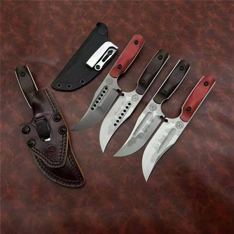 毒蛙战术直刀 全长:215mm 刃长:105mm 宽度:32mm 厚度:4.8mm 材料:vg10-真空热处理 硬度:60左右 重量:178克 柄材:红色G10,棕色亚麻柄 皮鞘:进口头层植鞣皮