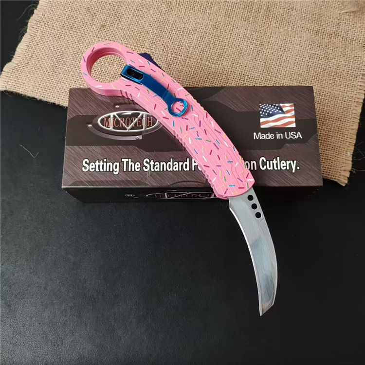 微技术甜甜圈红猛禽爪子跳刀 总长:22.7cm 刃长:8cm 刃宽:1.7cm 刃厚:2.5mm 刃材:440C 柄长:14.7cm 柄材:锌铝合金 柄宽:26mm 柄厚:14.8mm
