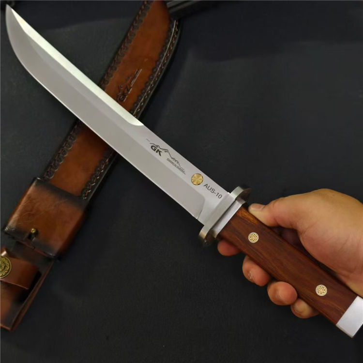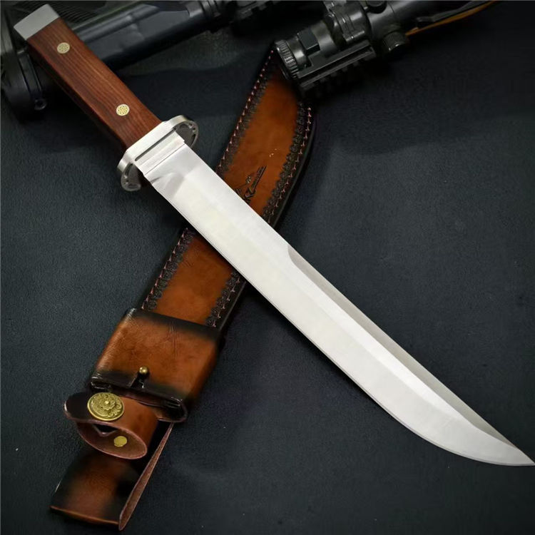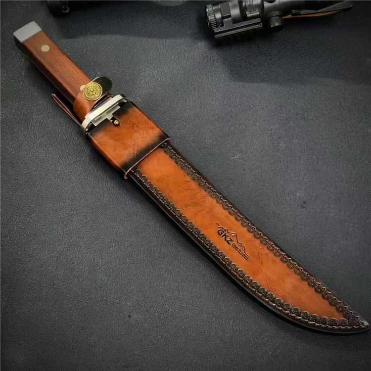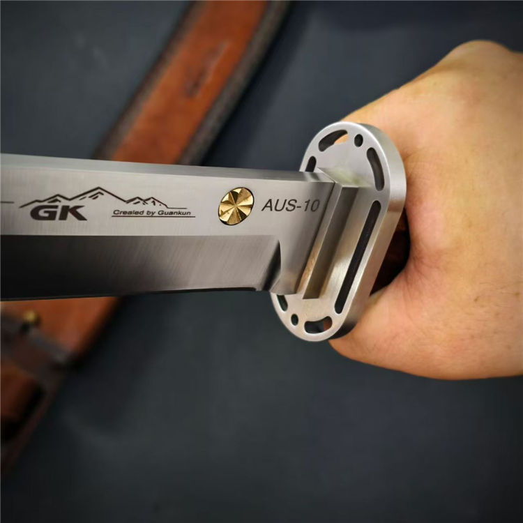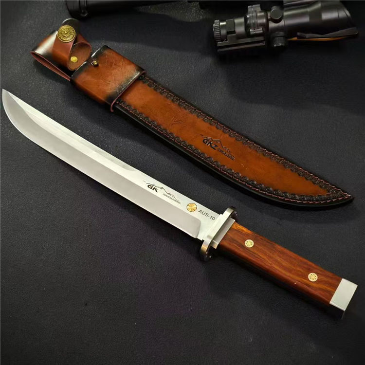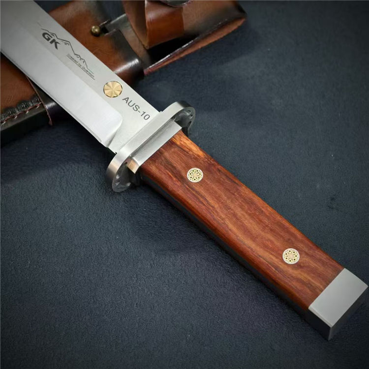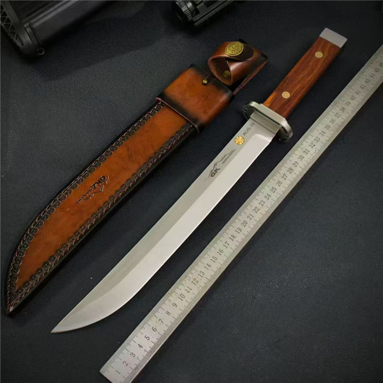 日式行者直刀 全长:44cm 刃长:29cm 柄长:13.3cm 刃宽:3.8cm 刃厚:6mm 钢材:AUS-10 柄材:酸枝木 重量:679g(含皮套810g)