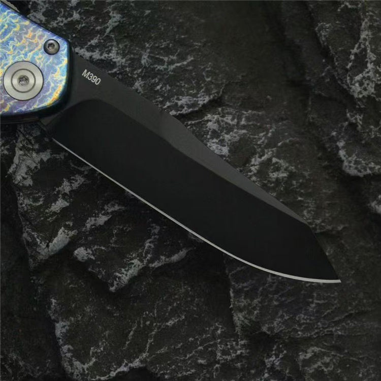 蝴蝶BM9400钛合金雷电纹侧开跳刀 全长:198mm 刃长:83mm 闭合:115mm 钢材:m390钢 刃厚:3mm 表面:鍍黑钛 硬度:60HRC 重量:108g 柄材:TC4钛合金经CNC电脑锣成型,极度精密 包装:原装黑彩盒,说明书,绒布袋