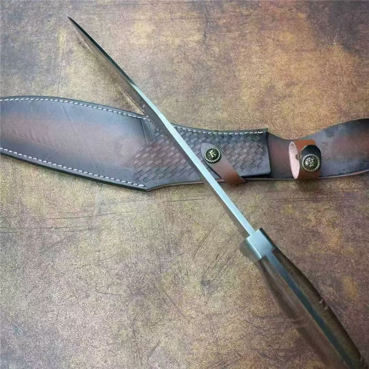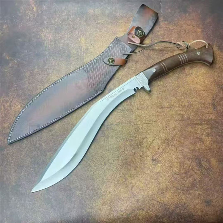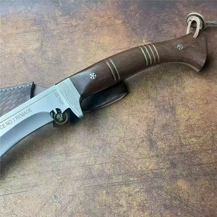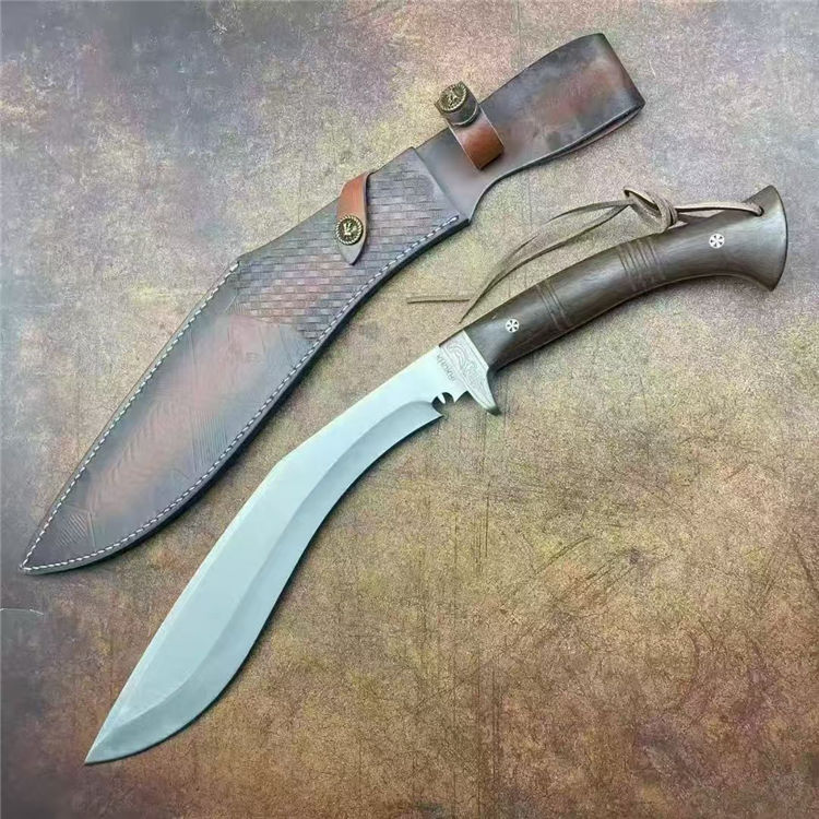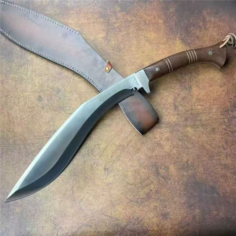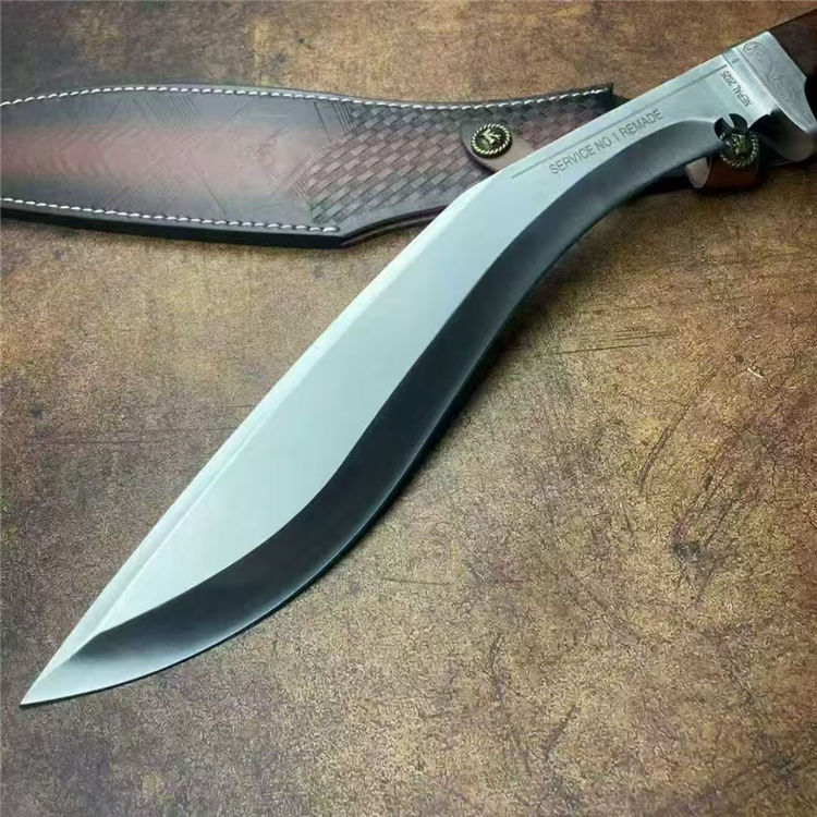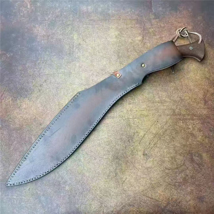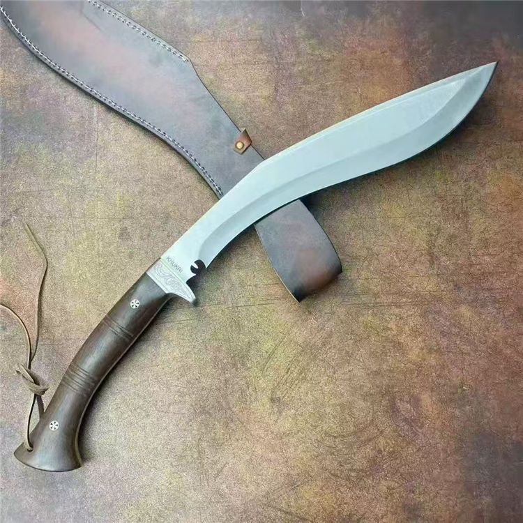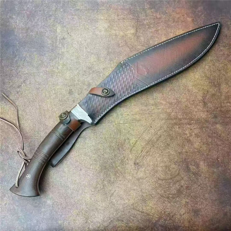 尼泊尔廓尔喀丛林狗腿弯刀 全长:61.5cm 刃长:41.5cm 柄长:19cm 厚度:5.5mm 硬度:60+-HRC 钢材:刃材AUS-10加真空深冷热处理 柄材:进口黑檀木 重量:1450g(含皮套)