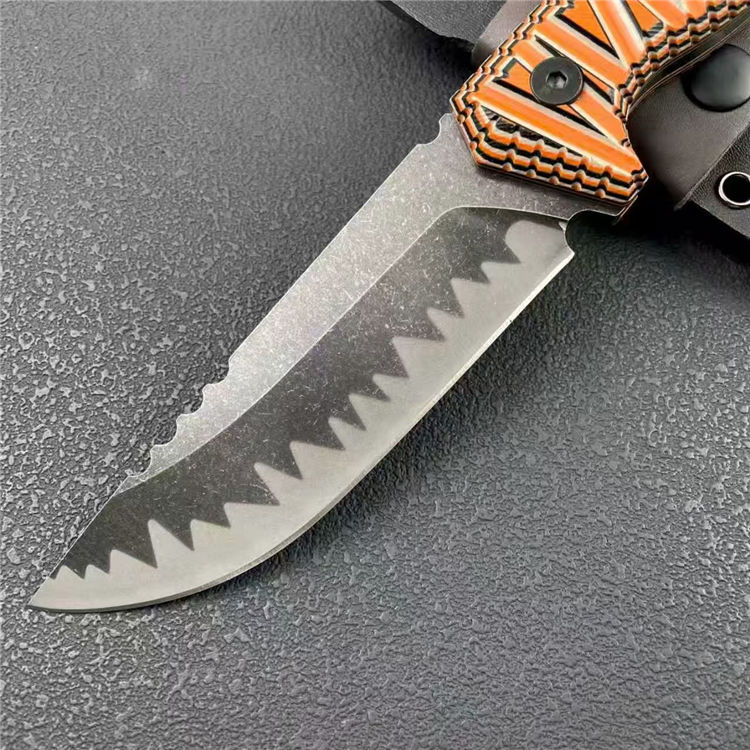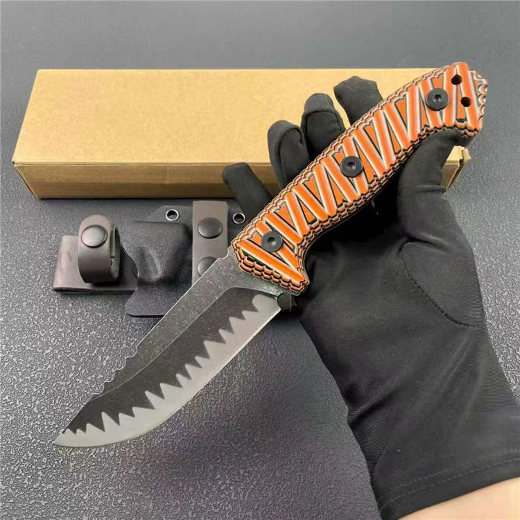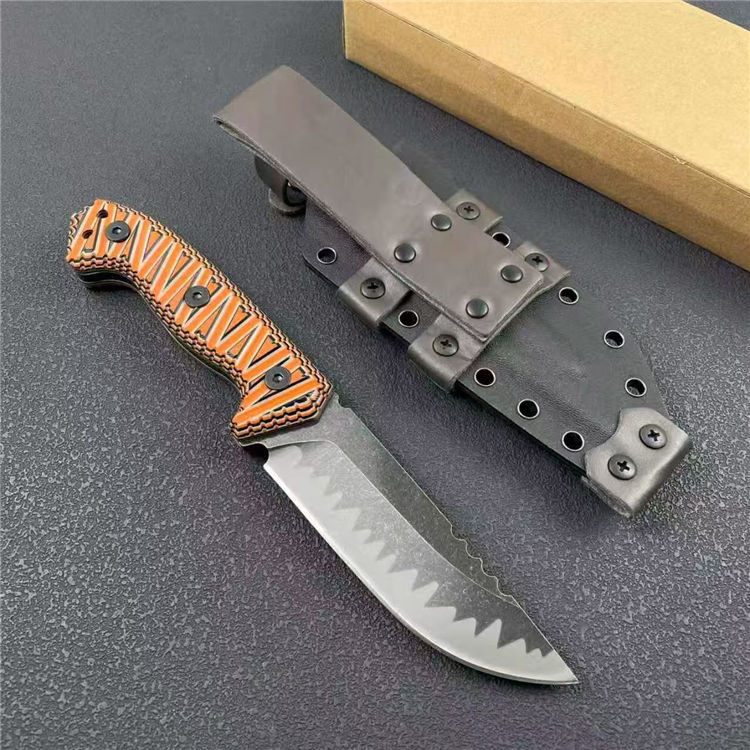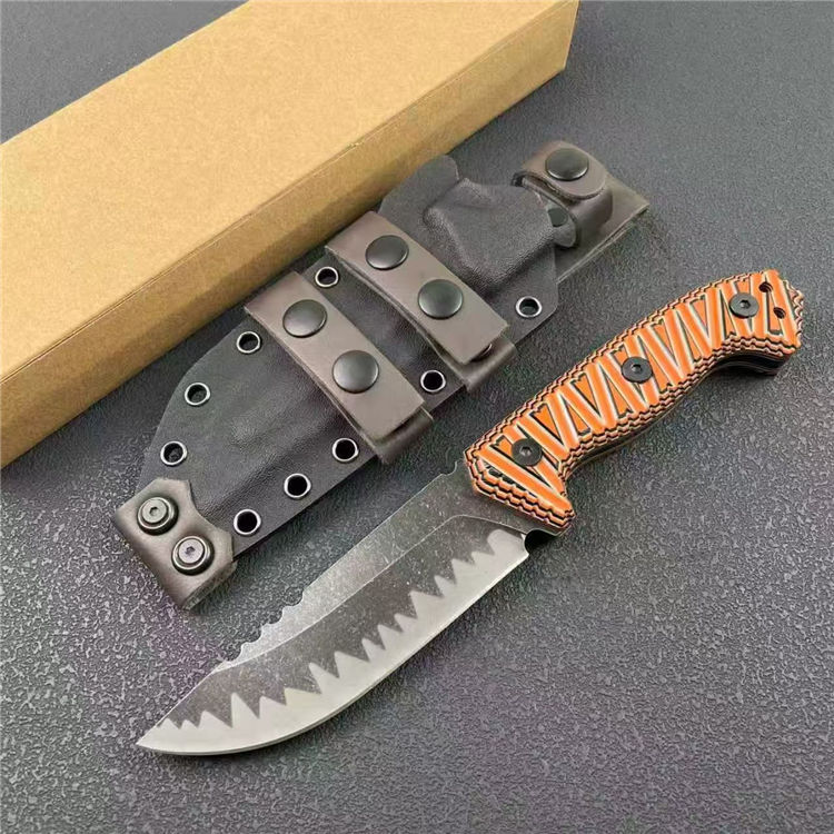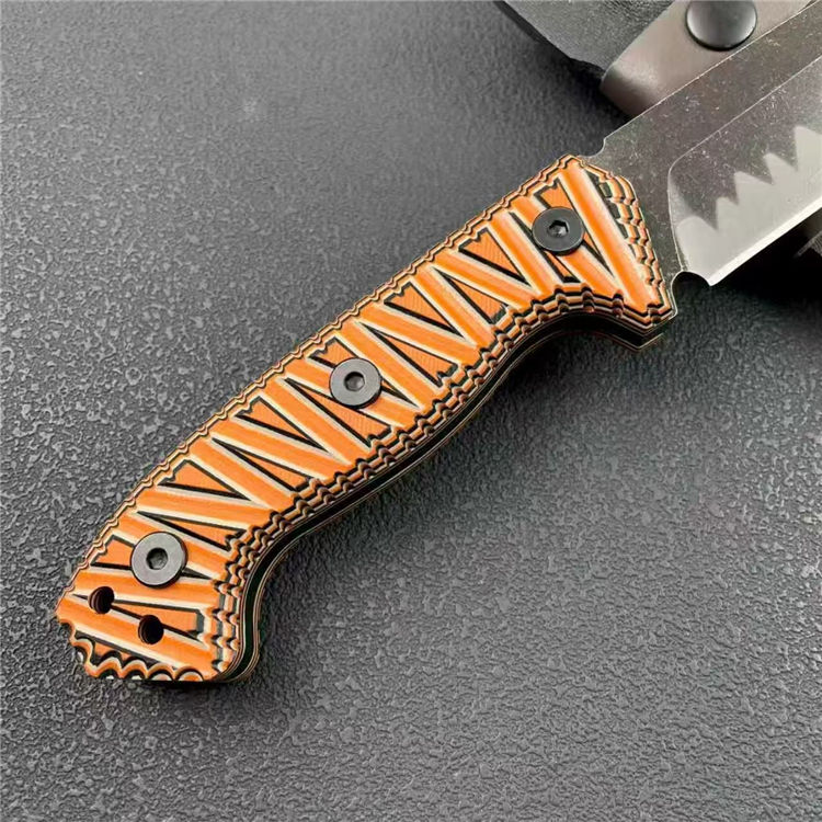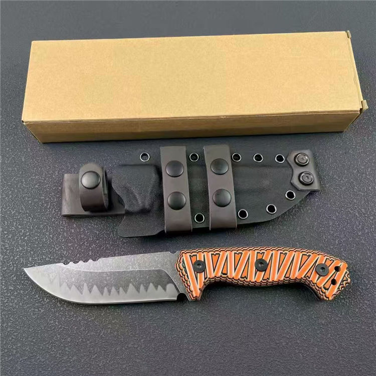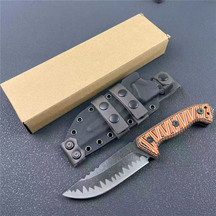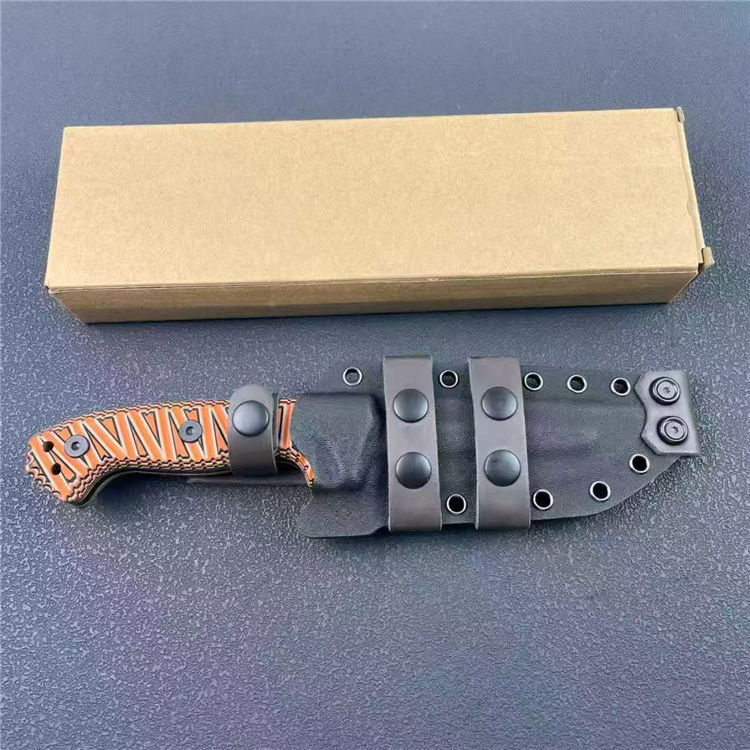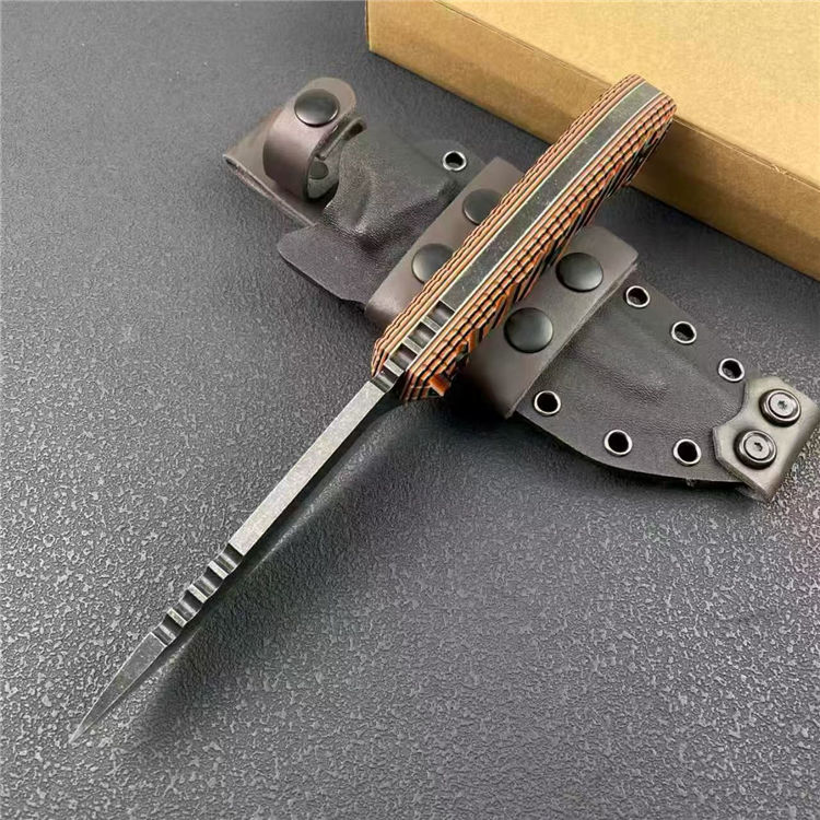 米勒M26直刀 全长:25.8cm 刃长:12.5cm 柄长:13.2cm 刃宽:3.8cm 刃厚:5.8mm 刃材:9CR14MOV 柄材:一体钢+双色G10 硬度:59-60HRC 净重:363G/481G(含K梢) 毛量:520G 包装:K梢+盒