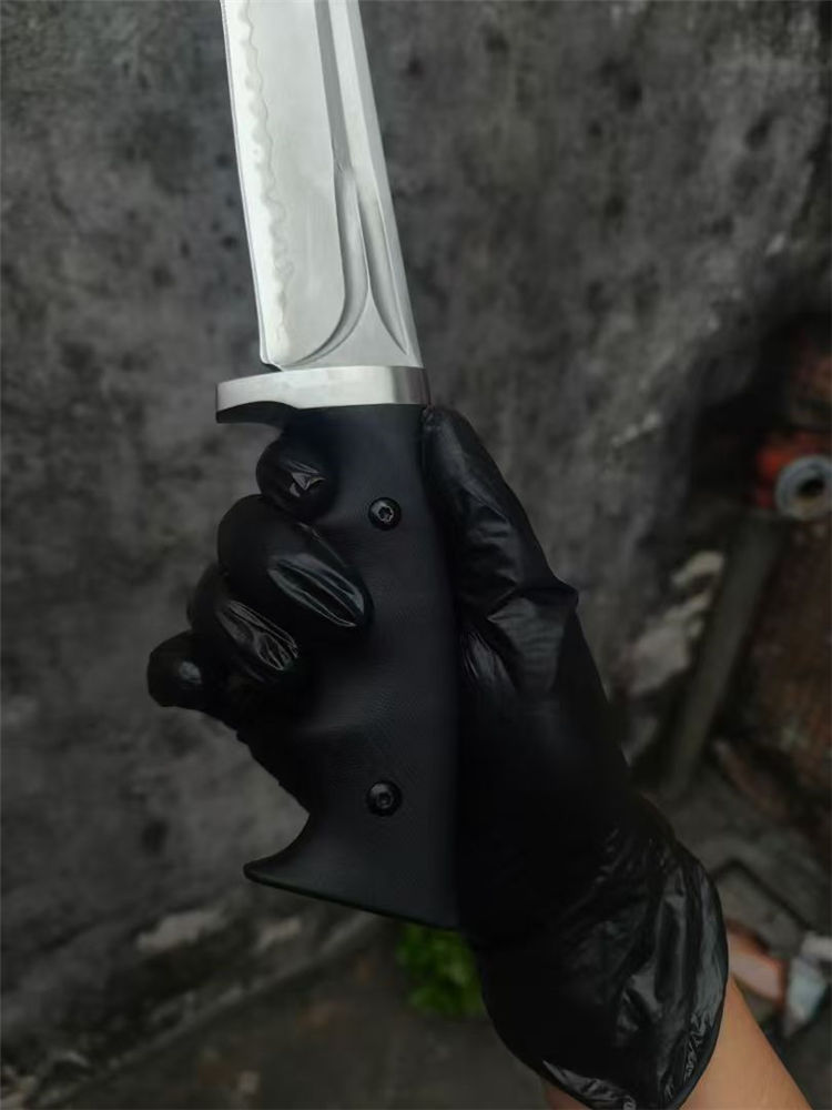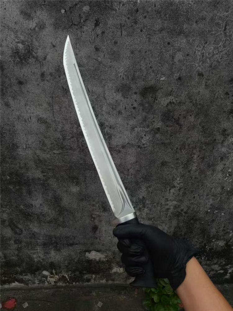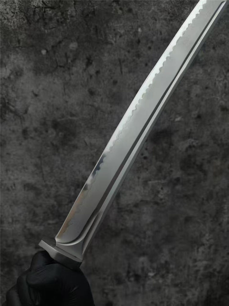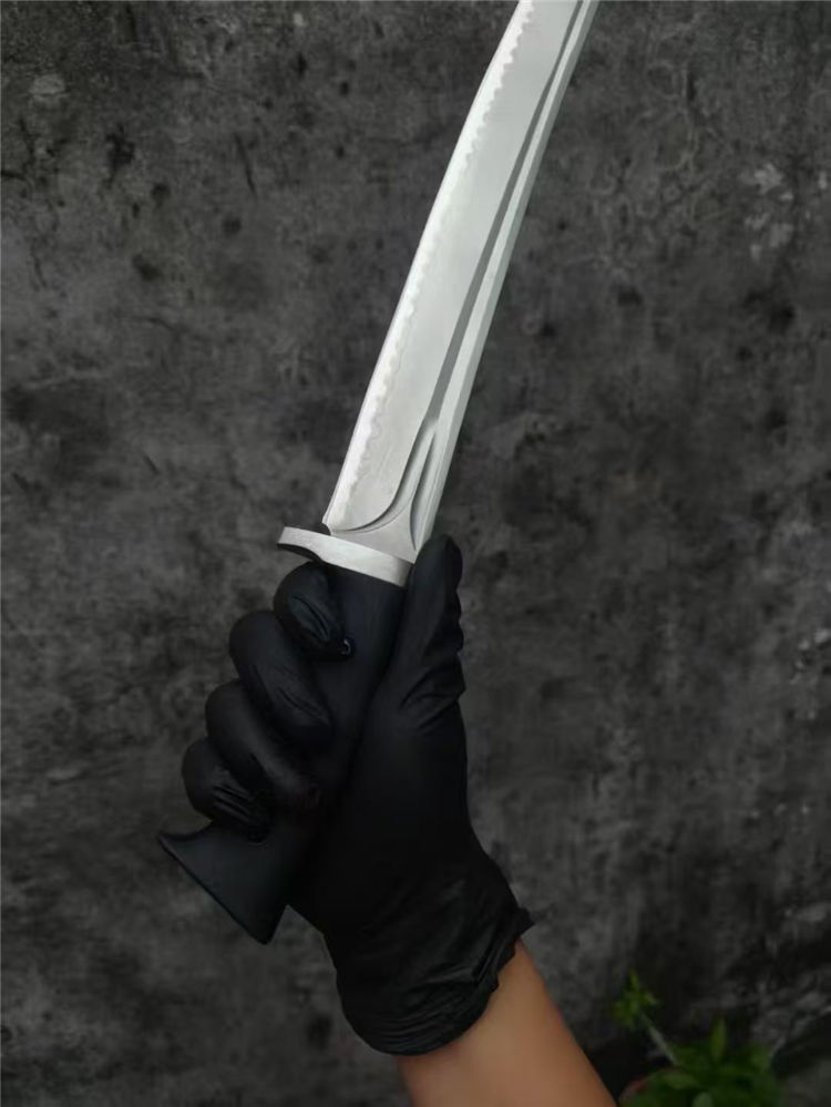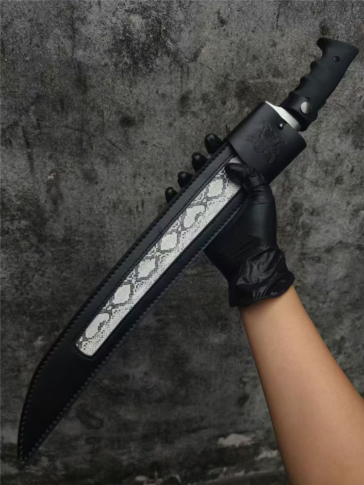 忠战术直刀 全长:555mm 刃长:420mm 厚度:0.6cm 钢材:SKD11 硬度:60HRC 手柄:G10 刀鞘:皮鞘