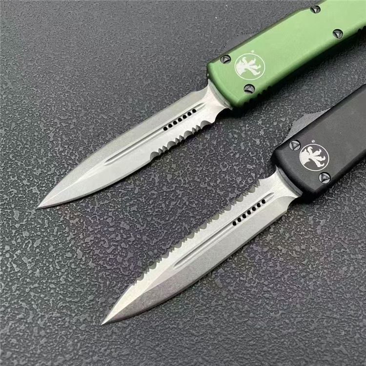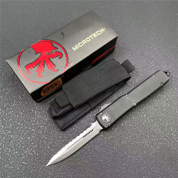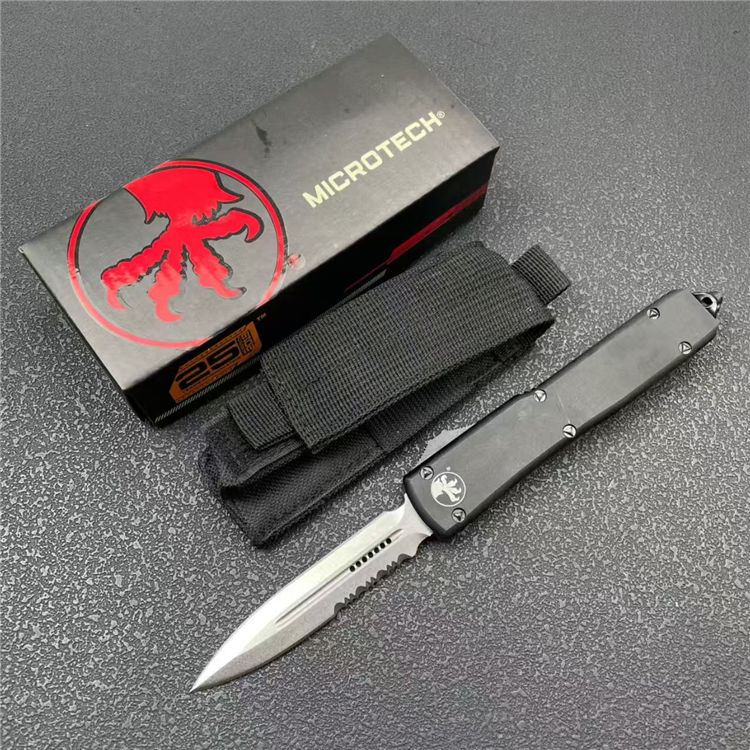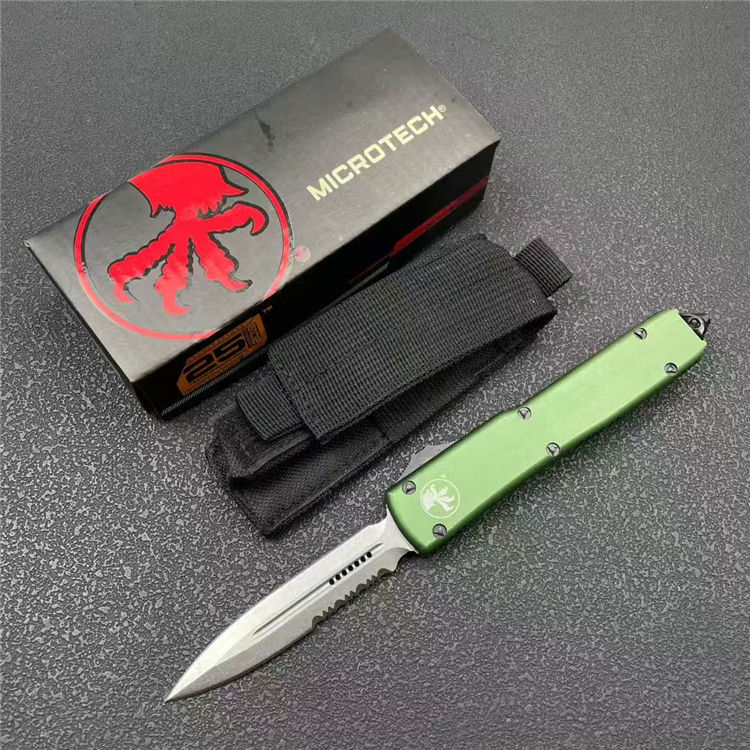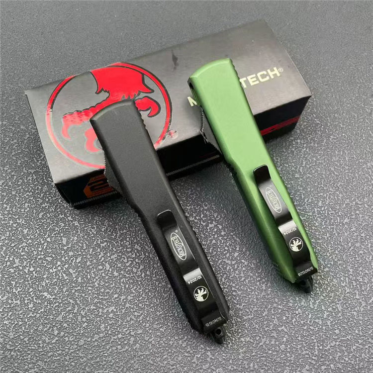 微技术铝合金UT85定制版直出跳刀 全长:22.5cm 刃宽:1.7cm 刃长:8cm 柄长:13.5cm 刃厚:1mm 刃材:7CR14MOV 柄材:铝合金 刀重:105G 毛量:168G 硬度:59-60HRC