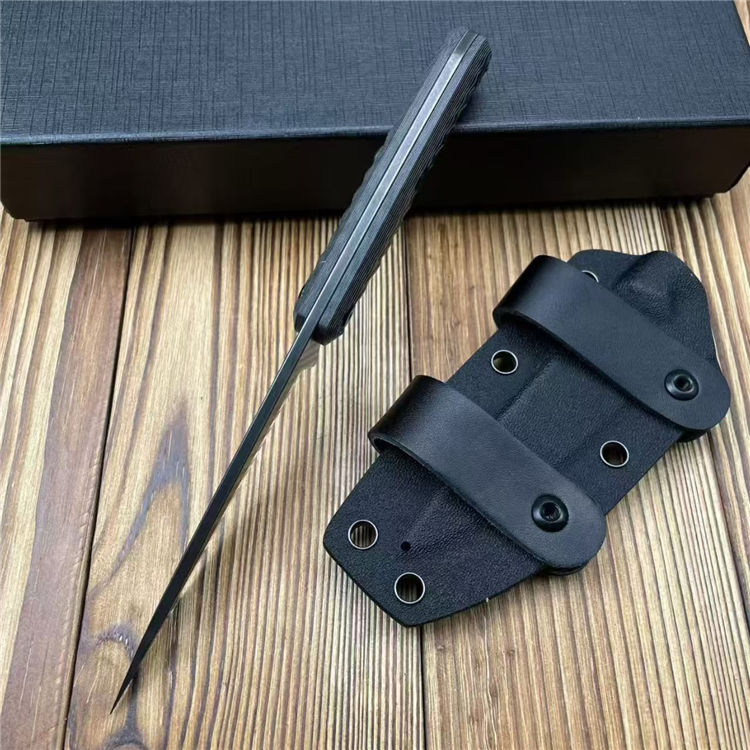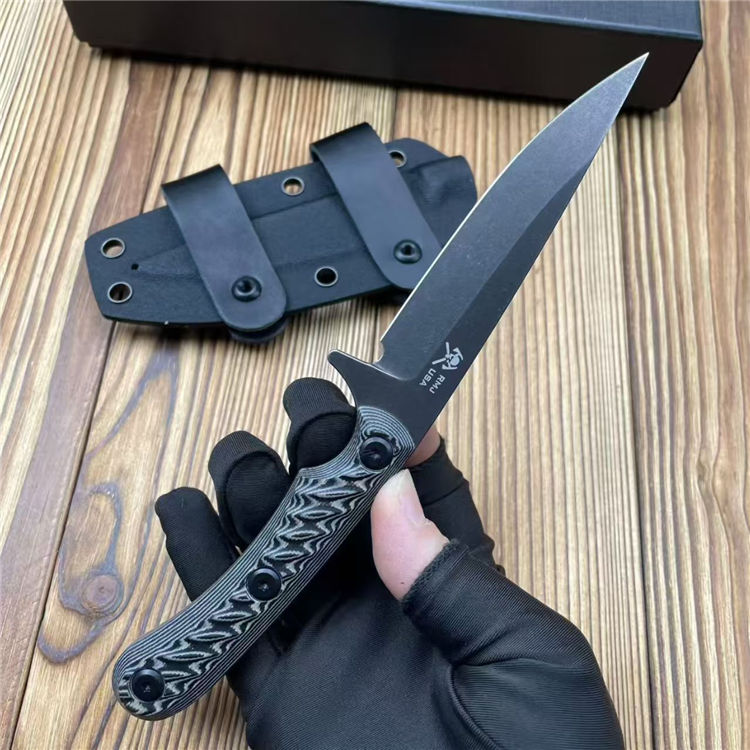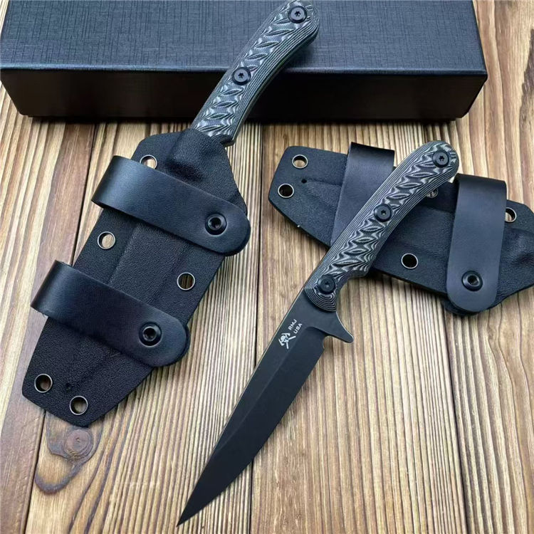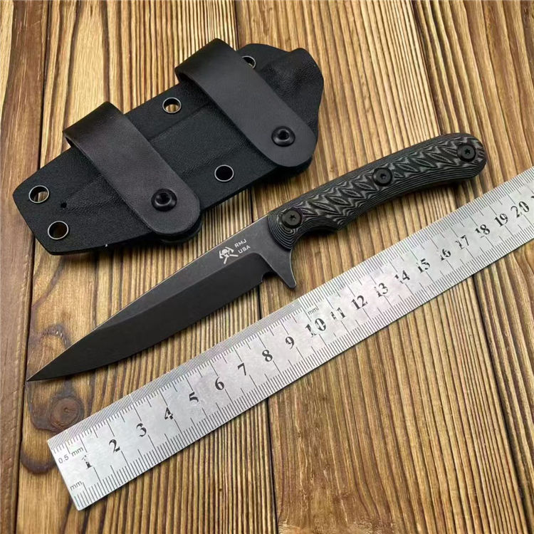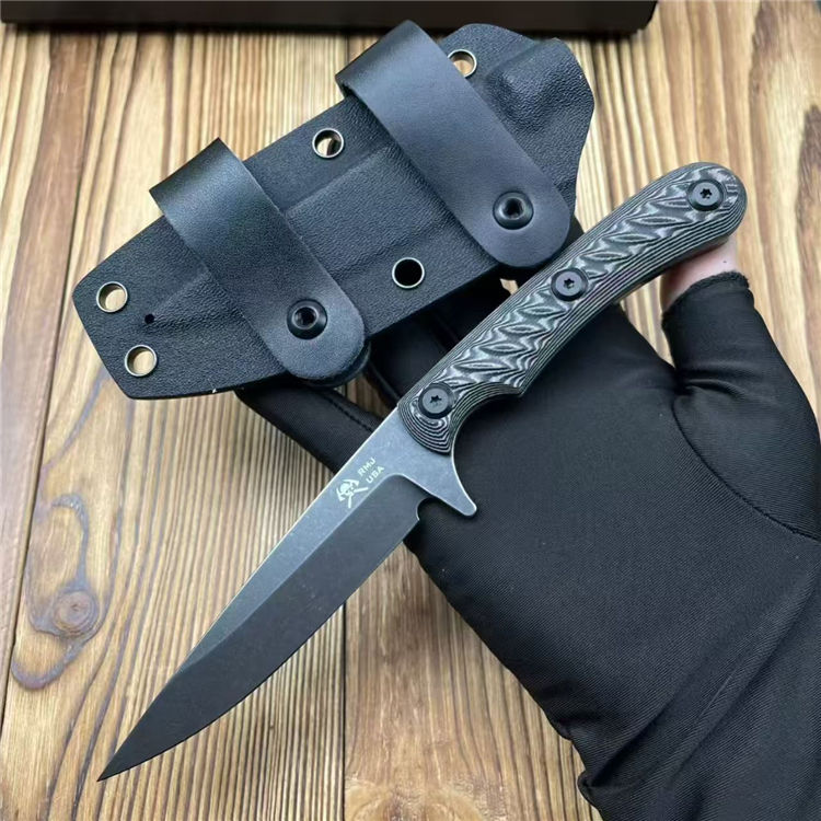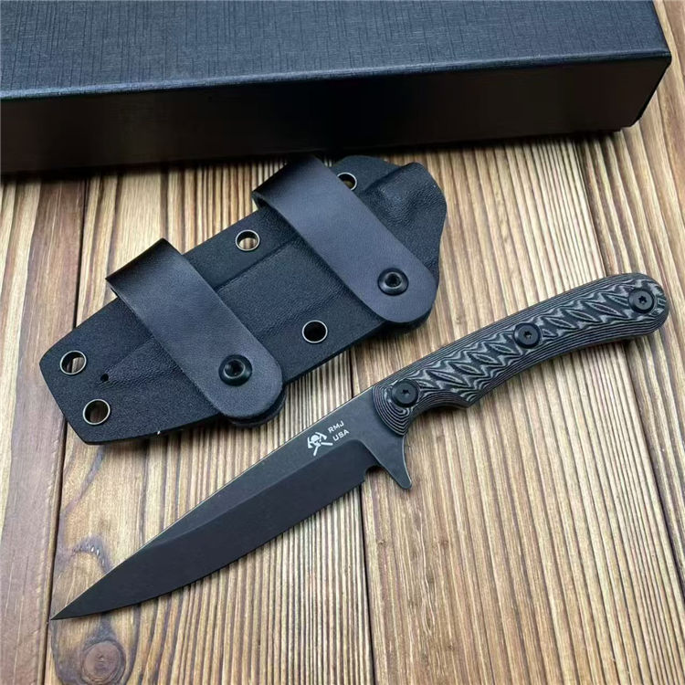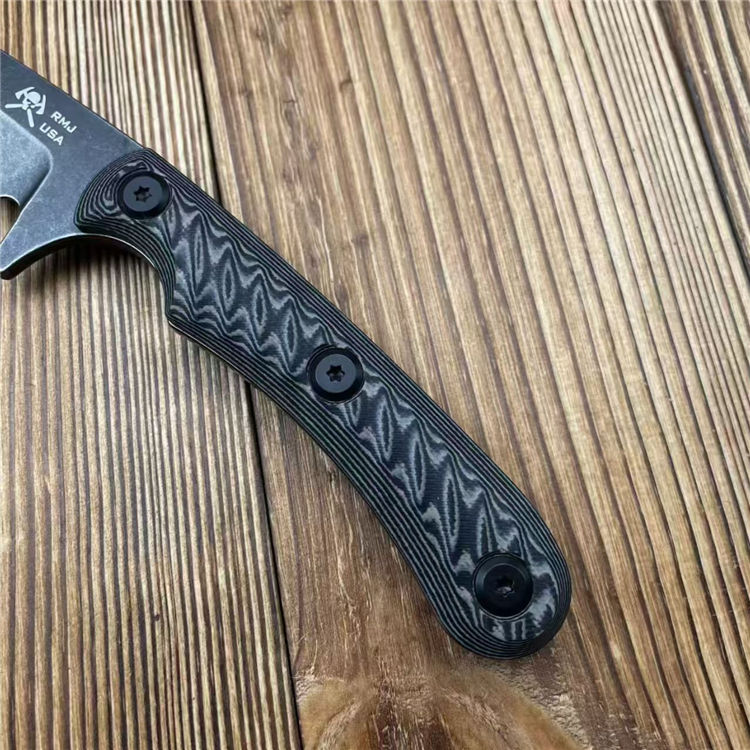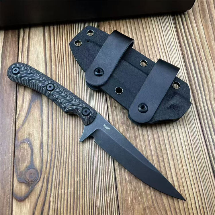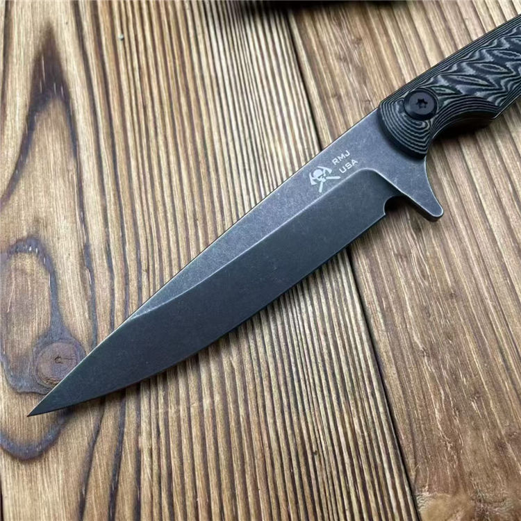 美国RMJ直刀 全长:19.5cm 刃宽:2.2cm 刃长:9cm 柄长:9.5cm 刃厚:3.2mm 刃材:M390 柄材:一体钢+G10 刀重:100G/143G 毛量:220G 硬度:58-60HRC