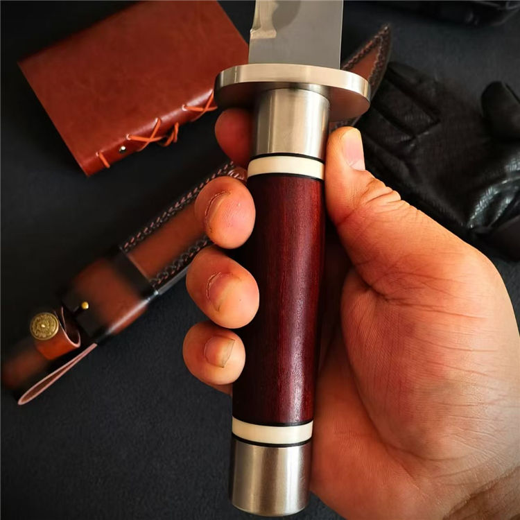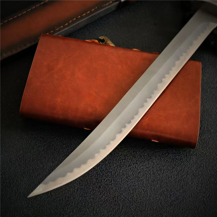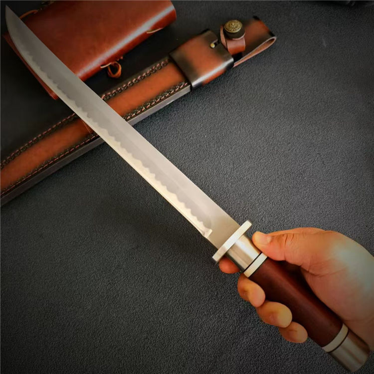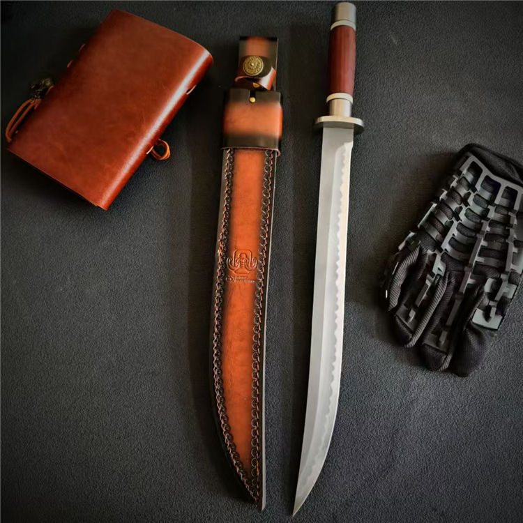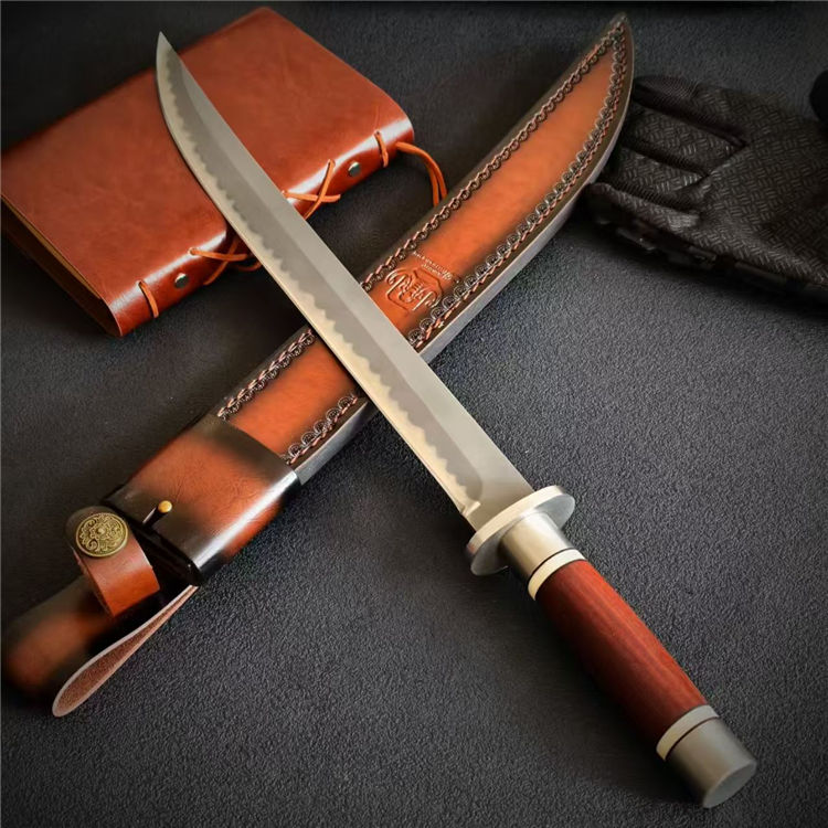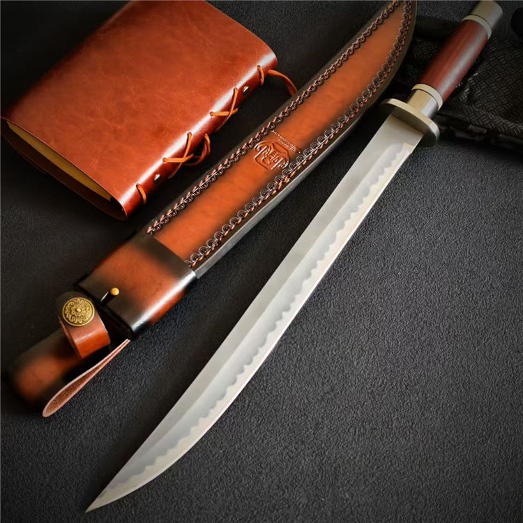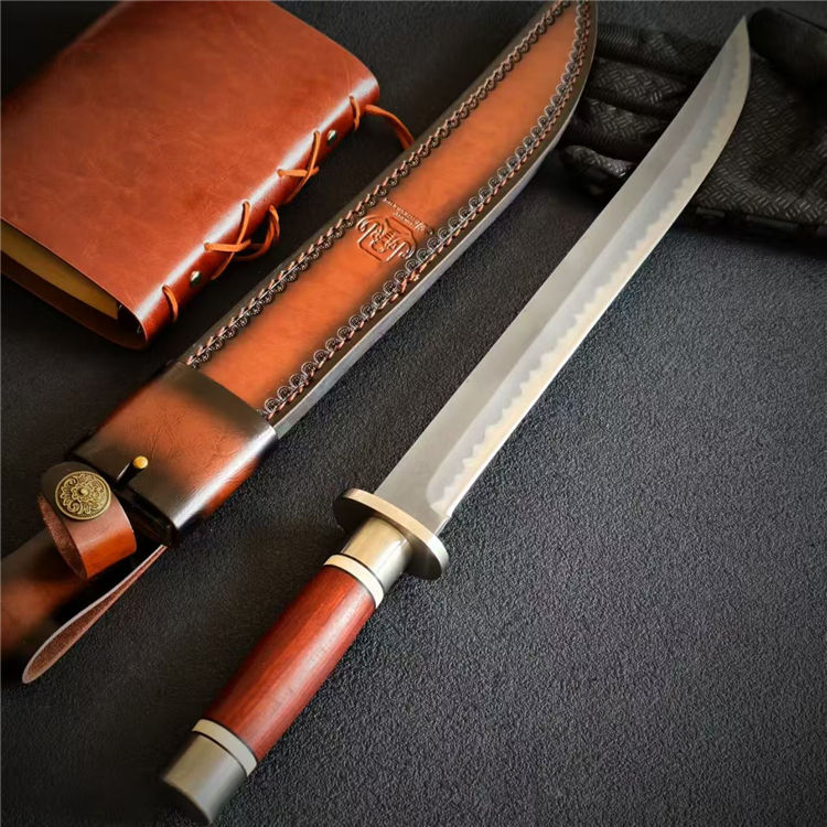 赤猿钢铁武士直刀 全长:49.5cm 刃长:34.4cm(有效刃长) 刃宽:2.9cm 刃厚:6mm 钢材:三合钢 柄长:12.7cm 柄材:红檀 重量:571g(含鞘:717g)