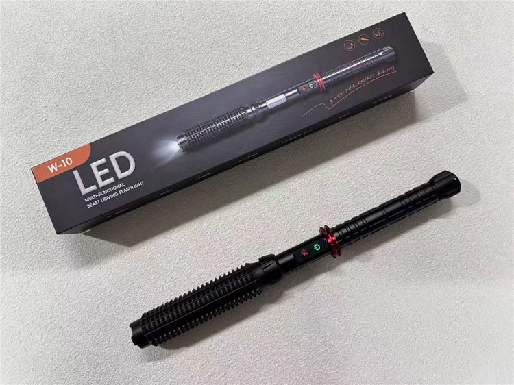 W-10防身手电电棍 前灯强光1500流明,前灯低光800流明 侧灯600流明,航空铝合金,配备两节18650电池 中间红圈陀螺旋转可把玩 保安巡逻首选