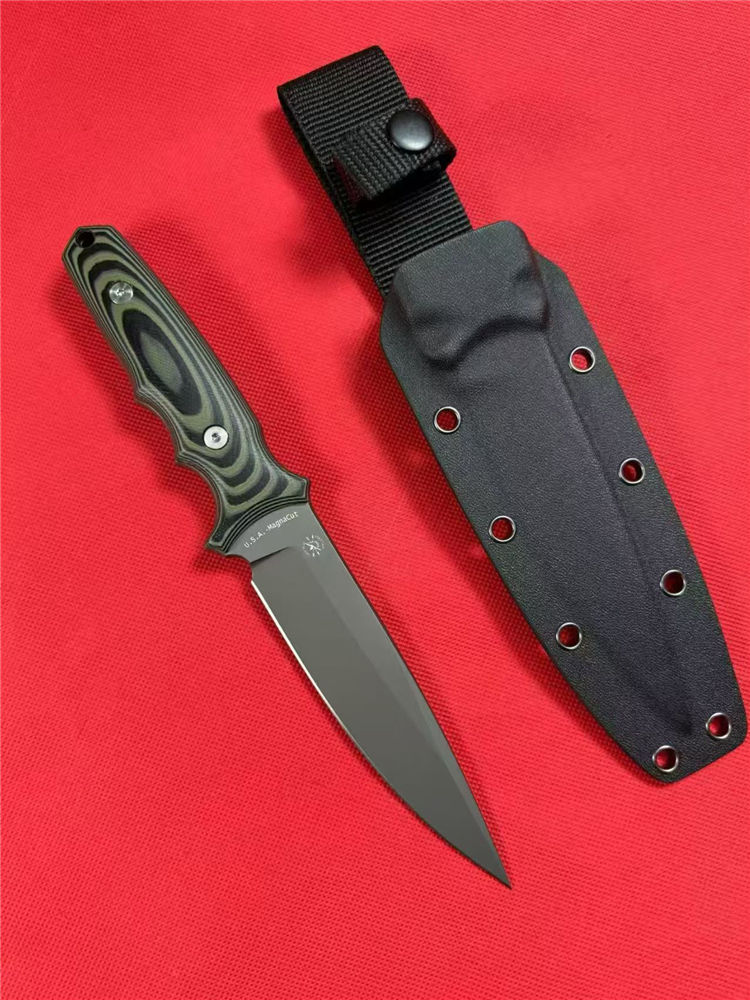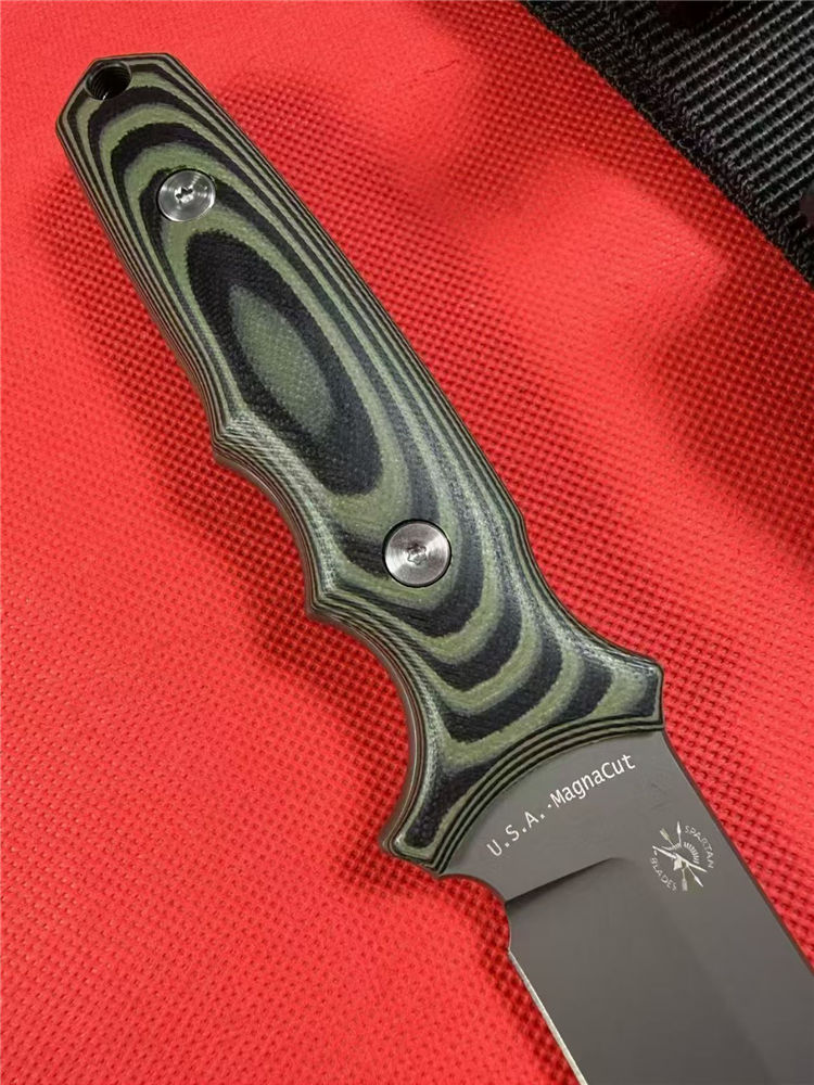 斯巴达秘密之刃直刀 全长:259mm 刃长:127mm开刃部分 柄长:119mm 刃宽:30mm最宽处 刃厚:4.9mm 刃材:8CR14MOV 热处理:真空油淬深冷高温热处理 刀重:245g/320g含鞘 硬度:59-60HRC 表面:镀钛 柄材:黑绿双色G10 结构:一体龙骨成型 刀套:战术K鞘+织带 包装:黑盒子